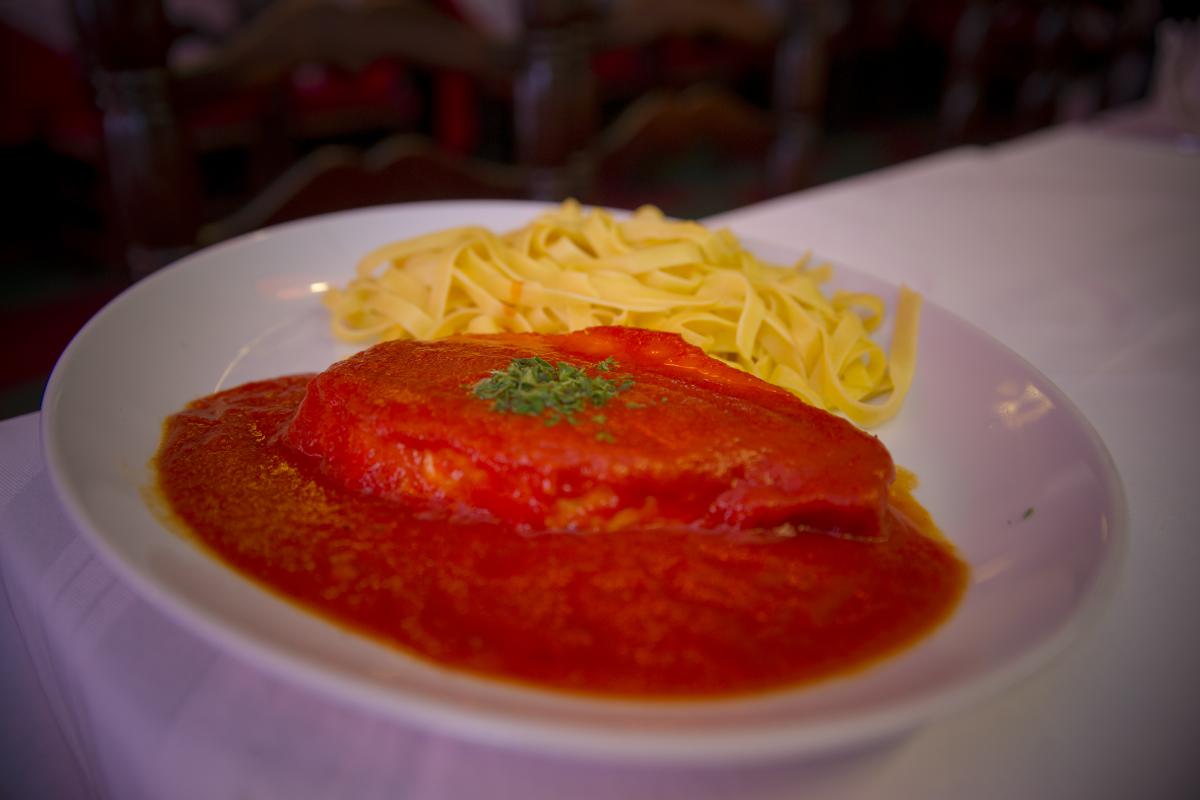 Ricetta italiana a base di vitello ricoperto con salsa di pomodoro e basilico a base di vino bianco, accompagnata da spaghetti fatti in casa. Con una spolverata di parmigiano.